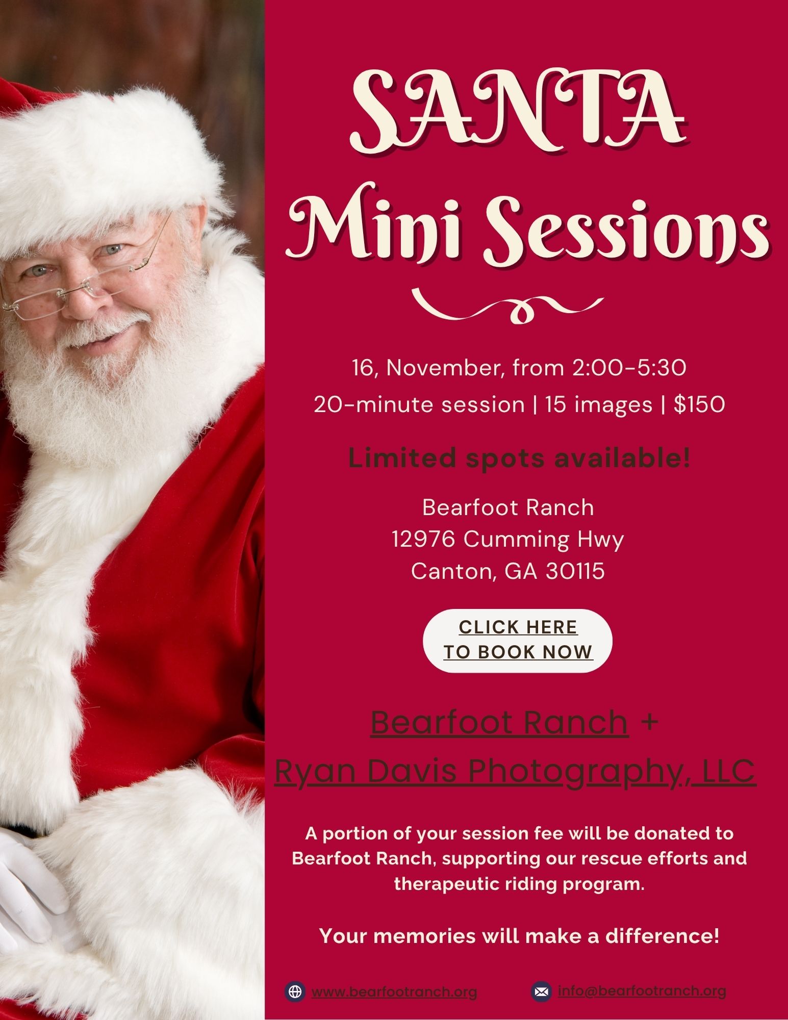 Join us for our Mini Photo Sessions and capture heartwarming moments with Santa and our rescue horses.
