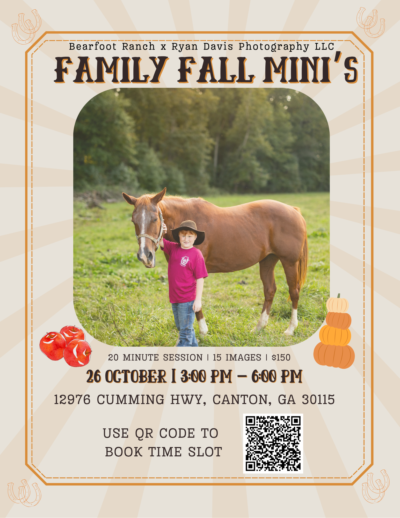 A portion of your session fee will be donated to Bearfoot Ranch, supporting our rescue efforts and therapeutic riding program. Your memories will make a difference!