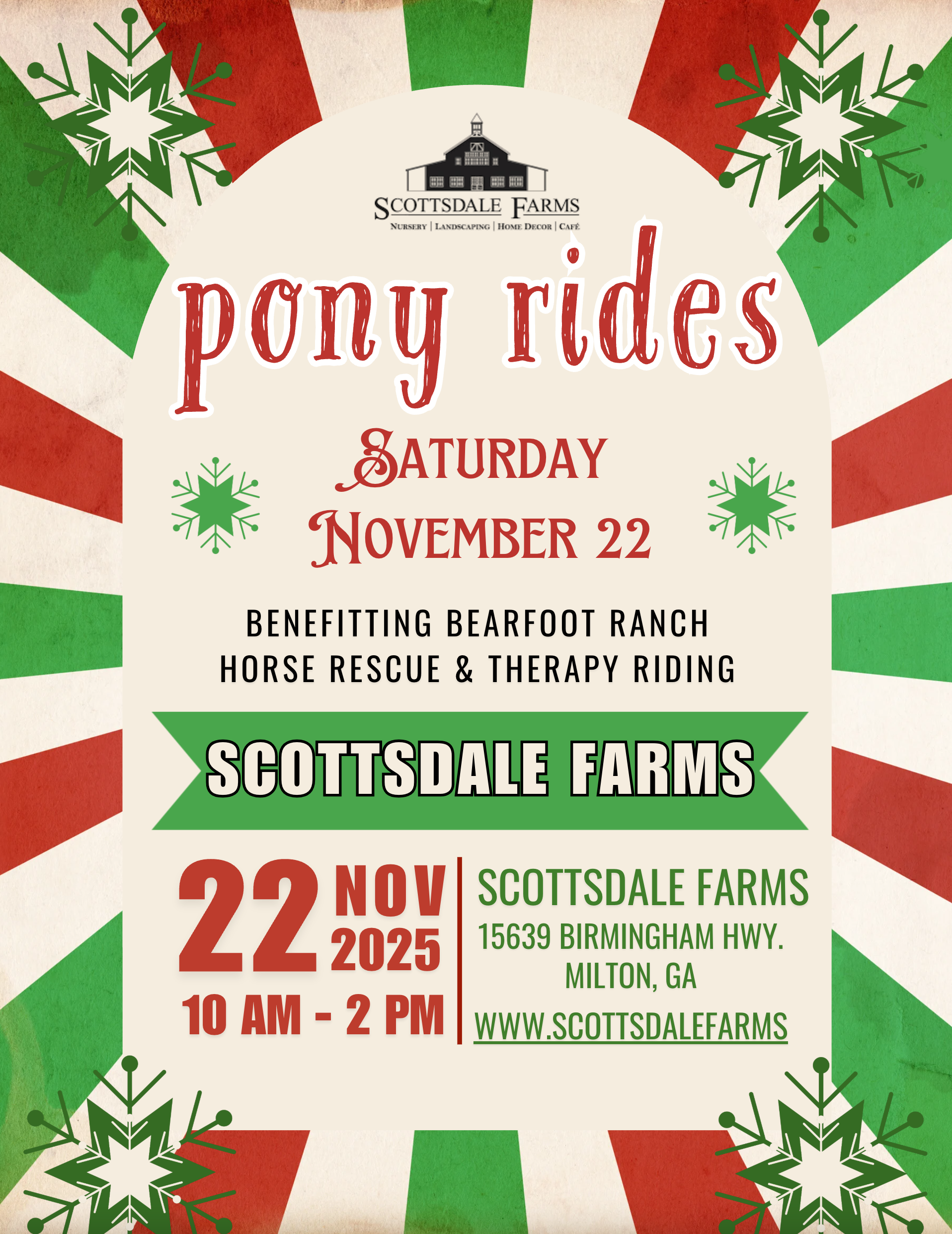Pony Rides @ Scottsdale Farms + Add to Google Calendar + iCal / Outlook export 00 days 00 hours 00 minutes 00 seconds Date Nov 22 2025 Time 10:00 am - 2:00 pm Location Scottsdale Farms 15639 Birmingham HWY Milton, GA Category Pony Rides Share this event